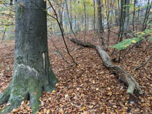 Bij een andere bosrand aan de oostzijde van Gulden Bodem krijgen we een lesje boomveiligheid. Wanneer zijn bomen nog veilig en hoe kan je dat wel of niet zien? De beuk die pas bij de Apeldoornseweg is omgewaaid zag er nog goed uit aan de buitenkant; goed in het blad. Maar na dat omwaaien werd pas duidelijk dat die boom maar door een dunne buitenlaag werd gevoed en de kern er minder goed aan toe was. Bij andere beuken met lange takken zien we dat de boom zelf ‘trekhout’ maakt om de balans te houden.